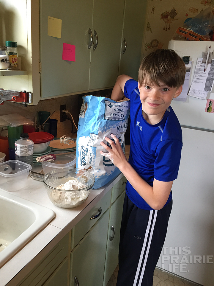 Here we have something I said I wasn’t going to do this summer. August wanted gold bars so badly, and wanted them way sooner than I was ready to be doing them, and they’re only five ingredients plus chocolate chips after baking, so I let him. I know kids cook and bake at 11yo all the time, but my patience helmet is wearing thin. I’m happily blaming Monica for the power of suggestion — even though he had no idea she suggested it, I suspect it’s the reason I conceded.